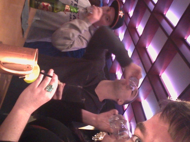Three men drinking hard liquor in a brightly lit bar with a wood covered ceiling.