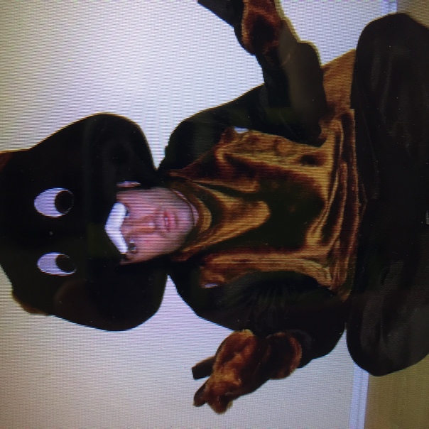 The man, wearing a giant brown dog costume, poses for a picture while sitting Indian-style on the wood floor.