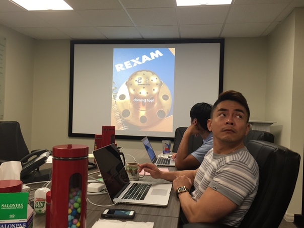 2 small men working on a PowerPoint presentation surrounded by red gumball machines.