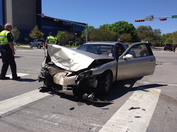 Two men in bright yellow vest stand near a silver car that was just in an accident.