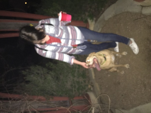 A person holding a red solo cup wearing a striped top and jeans stands beside a blonde, panting dog.