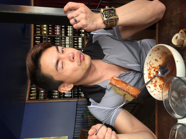 A man is seated at a bar as the sun sets, fork in hand, enjoying his food and drink.