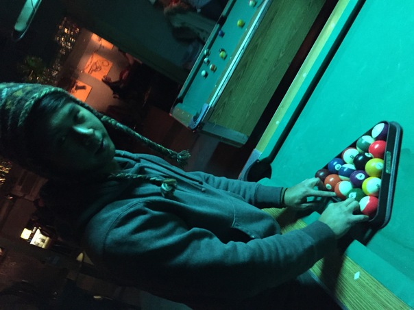 A young guy in a hooded sweatshirt and wool hat racks up the colorful balls for a game of billiards.