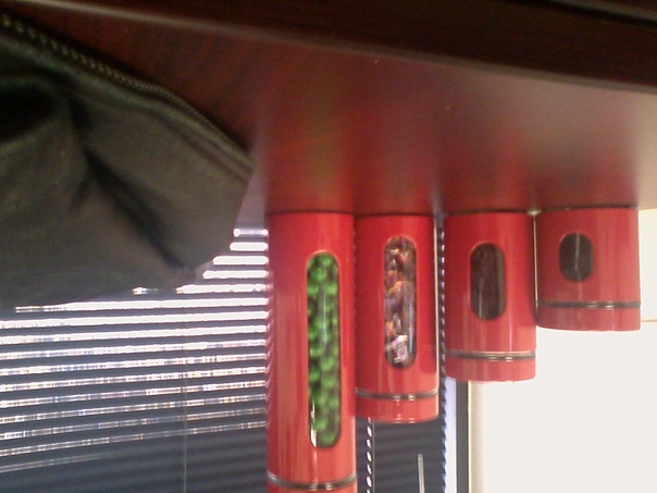 Four upside down red canisters on a counter near a window with miniblinds.