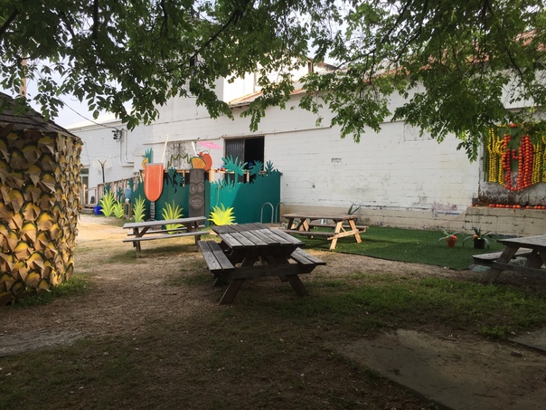 Picnic tables are ready for visitors at the famous tiki torch bar and grill.