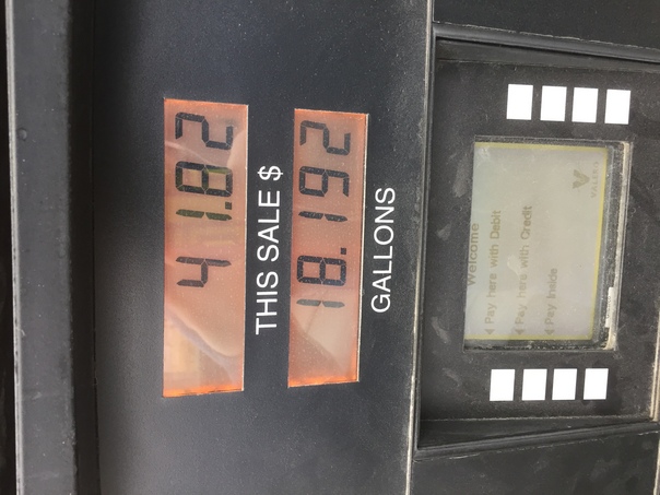 A black gasoline pump that was just pumped for 18 gallons costing $41.