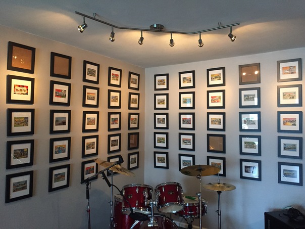 A room with lots of small framed images on it's walls.