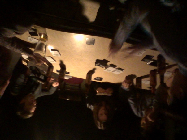 Upside-down turned blurry photo about a seemingly friendly card game around a round table with young people drinking.