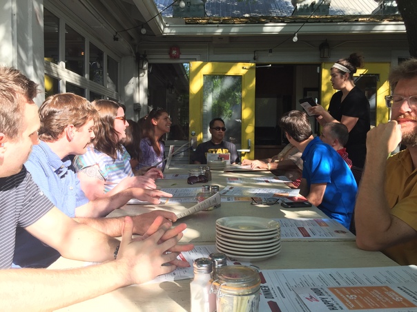 A group of people sitting at a table with a stack of clean plates.