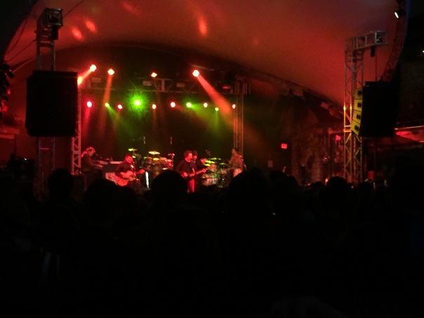 A band with bright green and red lights shining on stage, performing in front of a crowd of people.