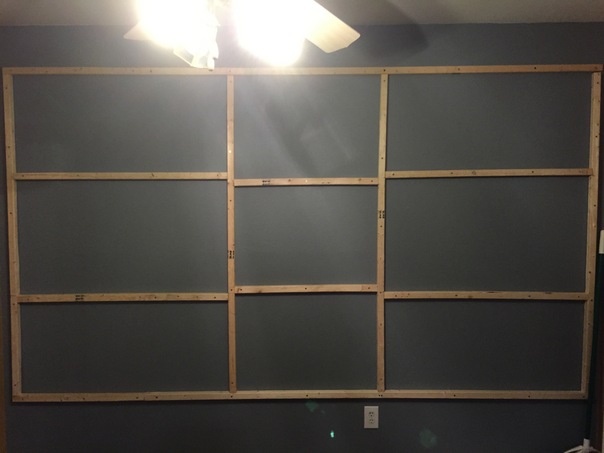 Wooden framework is nailed to the wall in nine rectangular sectors.