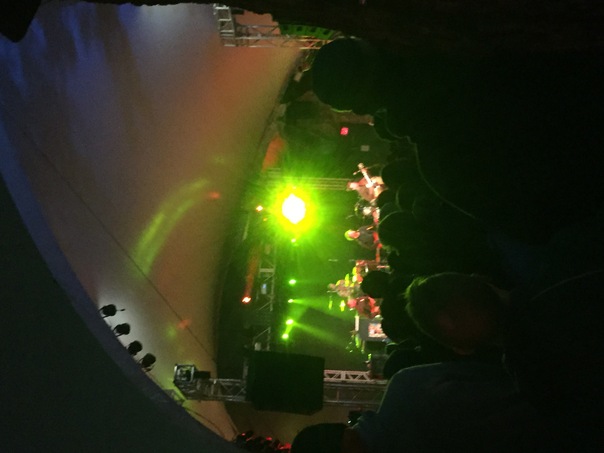 A group of people sitting around a stage that is lit by a green light.