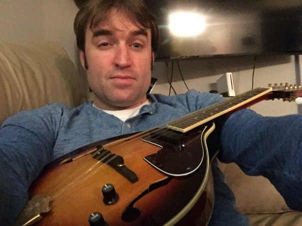 A man in a blue shirt taking a selfie with his musical instrument.