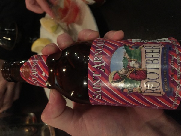 A hand is holding a bottle of handcrafted Saint Arnold beer.