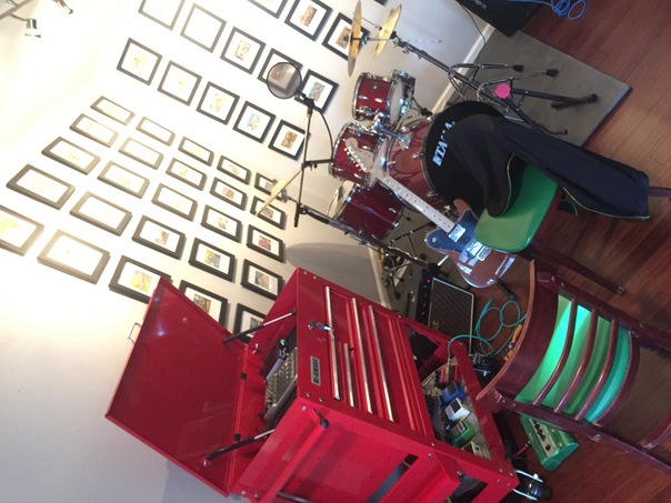 different instruments in the room with black bordered pictures on the wall