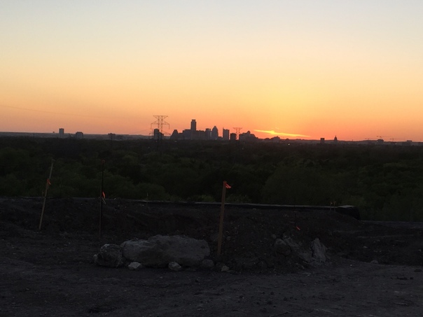 From a distance at some sort of abandoned location, we see the beautiful sunset skyline of a city.
