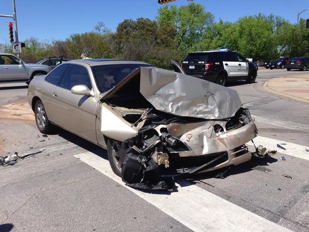 A car with a wrecked front end and car parts scattered on the pavement.