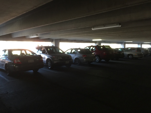 A parking garage has spaces occupied by crossovers, sedans, and compacts.