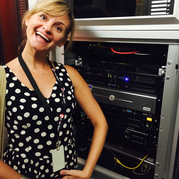 A blond woman wearing a black and white polka dot shirt poses in front of musical equipment.