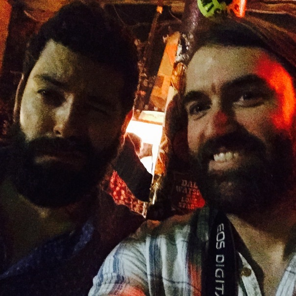 Two men with fully grown beards shamelessly take a selfie together at night in public.