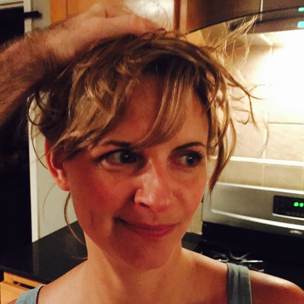 A woman in a kitchen is posing with a man's hand on her head to keep it in a crazed mess on purpose.