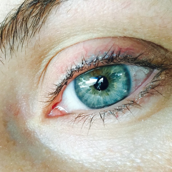 The picture was of a eyeball, the mans eye color was blue and his skin was fair.