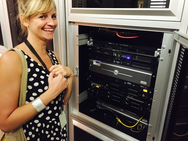Here is a caucasian female in a white & black polka dot dress standing next to an opened cabinet containing huge electronic equipment.