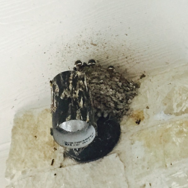 This shows a birds nest, with three tiny birds peeping out, built up on the side of a modern light fixture.