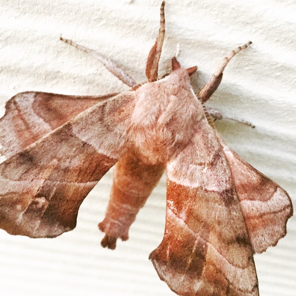 A brown moth with a fuzzy beige body is perched on a white, bumpy surface.