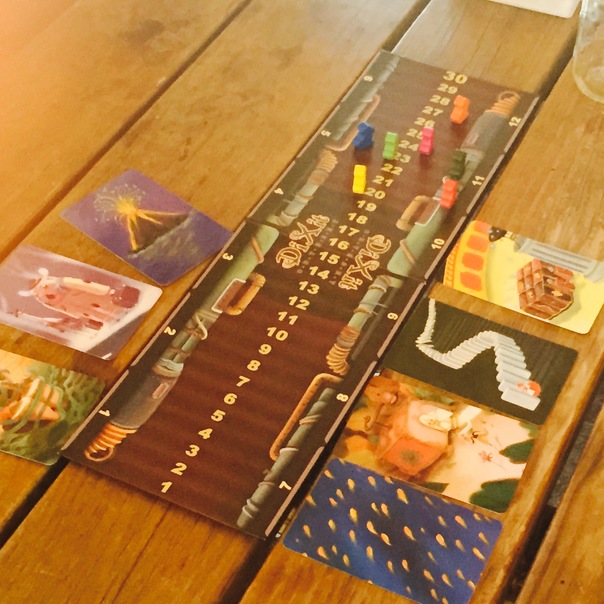 A game of several different cards, one blue with yellow dots, one with dominoes, a volcano and some others.
