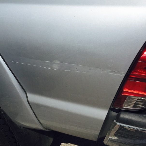 a close up picture of a gray vehicle with multiple scratches on the rear.