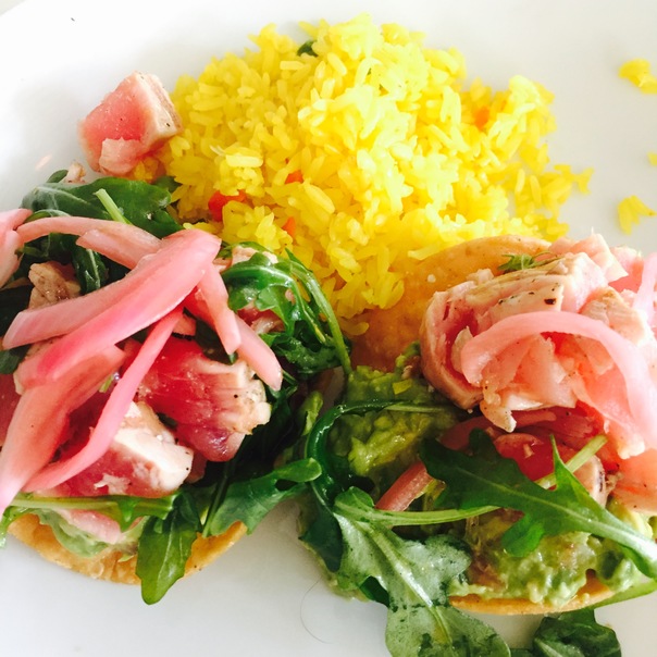 The yellow rice looks really vibrant when compared with the green lettuce and pink tuna.
