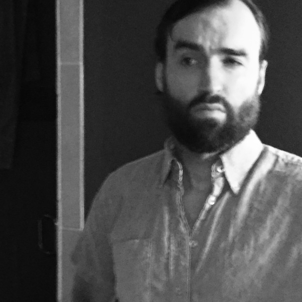 A dark haired man with short beard and light color shirt stands with a reflective expression on his face.