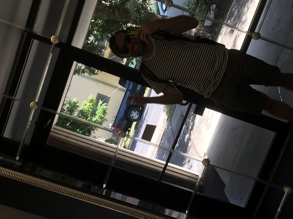 A man in a white and blue stiped shirt is waving while talking on his cell phone.