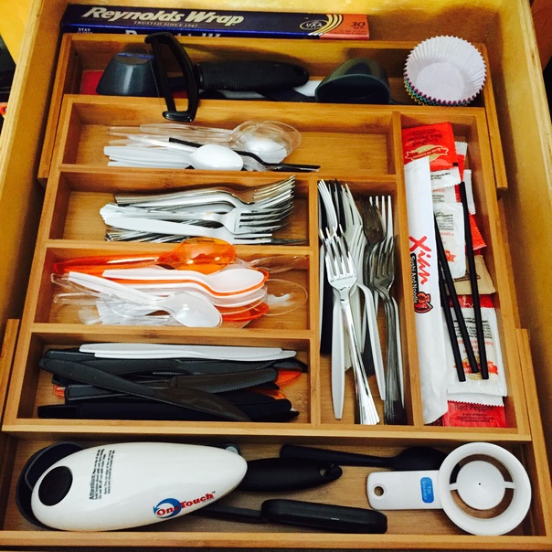 wooden drawer filled with spoons, knives, measuring cups and packets