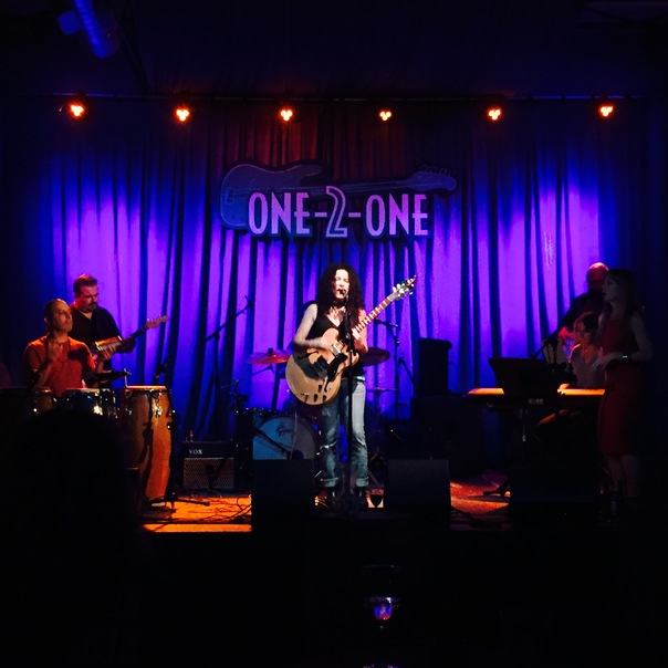 A woman sings and plays guitar on a stage during a concert.