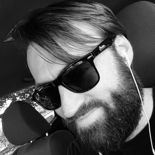 A man with a beard is taking a black and white selfish while wearing sunglasses and ear buds.