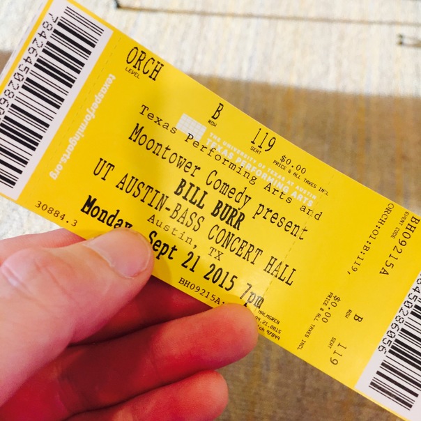 This bright yellow ticket is for a show by comedian Bill Burr at the Univerity of Texas.