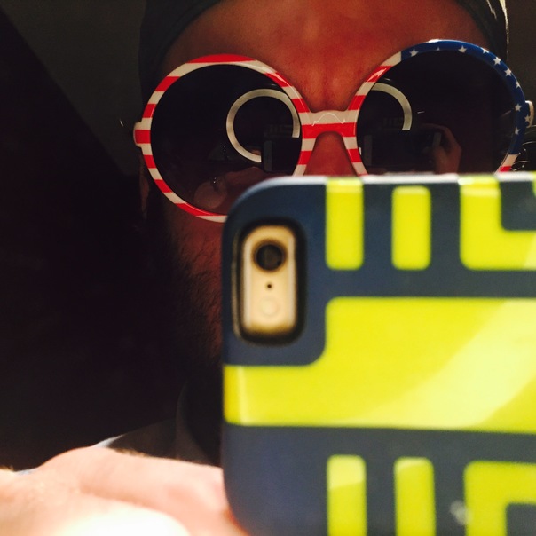 A man holds a boldly patterned smart phone screen in front of his goofy but patriotic glasses.