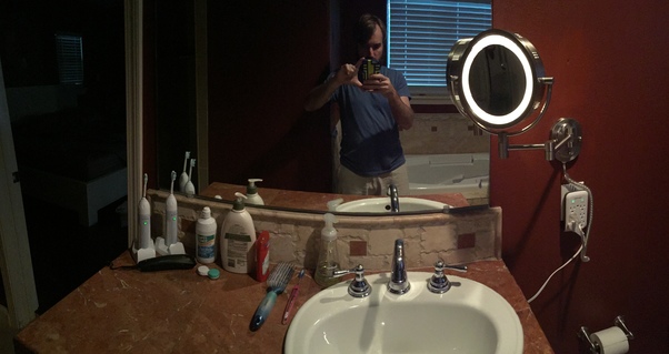 A man taking a picture of himself with his camera using the bathroom mirror.