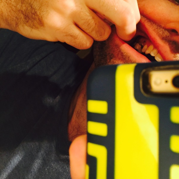 This photo shows a man pulling his lips apart and holding a phone in front of his face as if he is photographing the inside of his mouth.