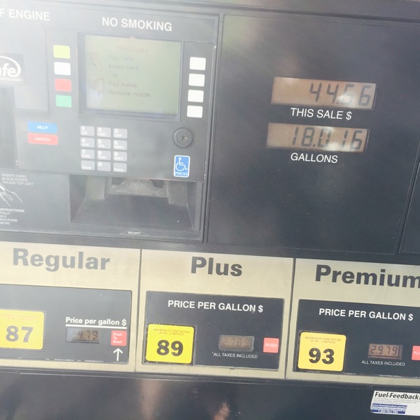 There is a gas tank with a meter and a display that says that the total sale was %44.66 for 18.016 gallons.