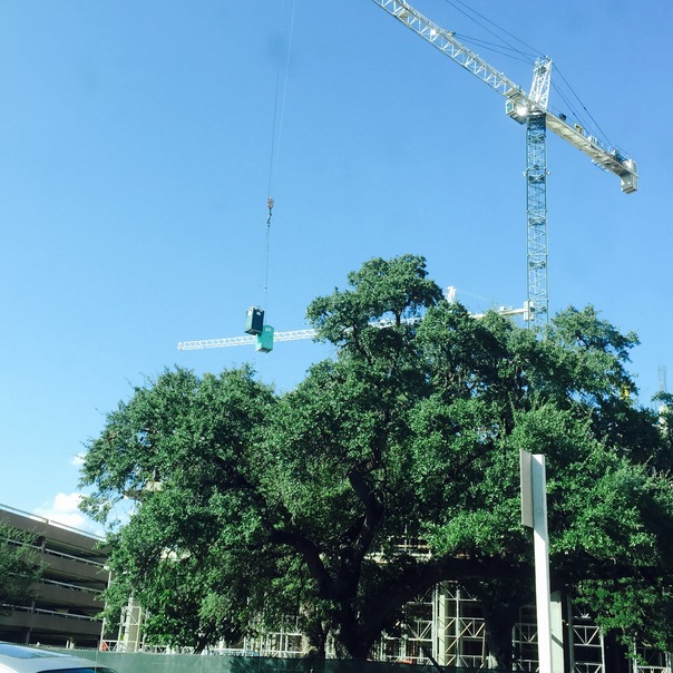 Two porta-potties are dangling from the edge of a crane at a construction site.