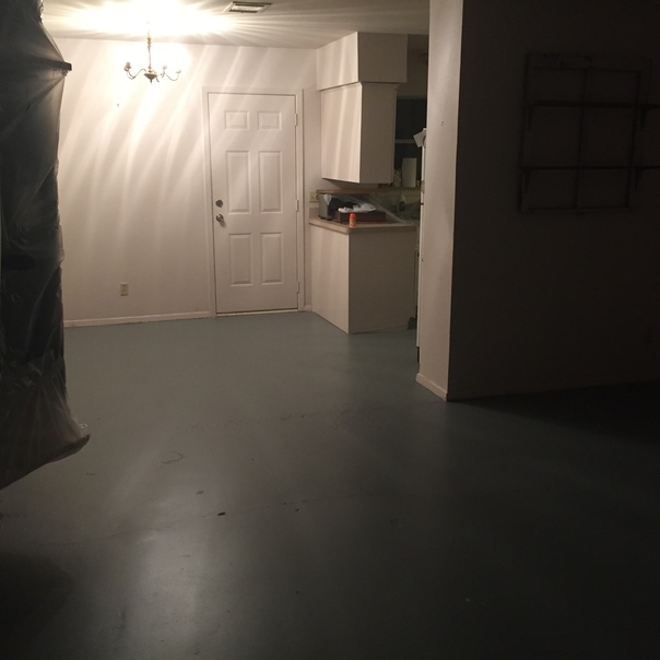 The white walls of this basement contrast with the gray cement floor.