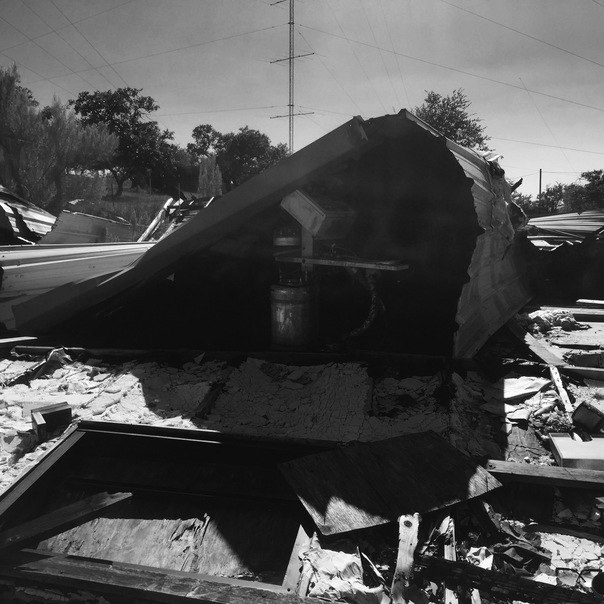 a gray photo of a seemingly homeless mans made shelter in a rugged area of destruction.