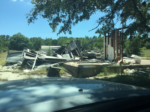 A demolished house is viewed through the windshield of a car in the bright middle of the day.