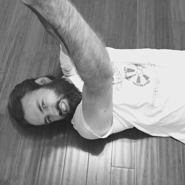 A bearded man with hairy arms and a t-shirt poses for a snapshot.