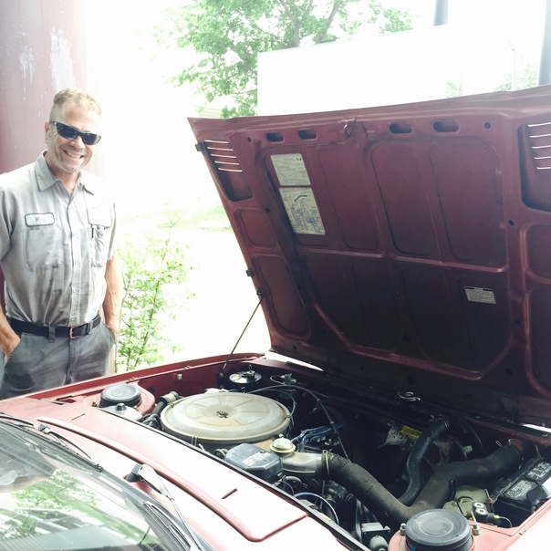 a mechanic wearing sunglasses stands smiling with the trunk open to a vehicle.