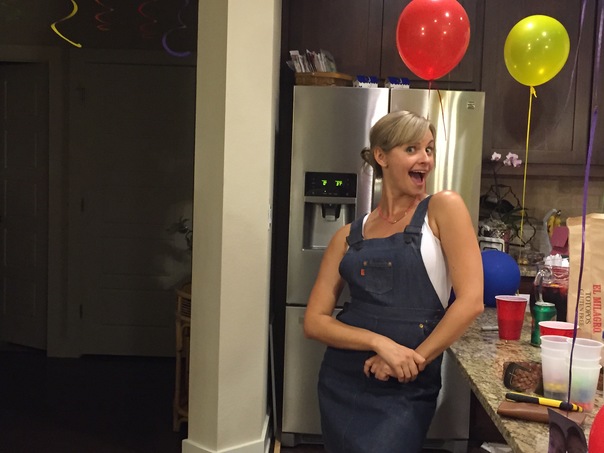 a beautiful blonde woman looks to the side and smiles widely in a kitchen.