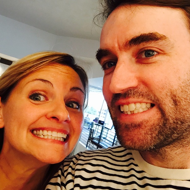 A good-looking couple aged in their twenties or thirties are smiling toothily while taking a selfie in an airport.